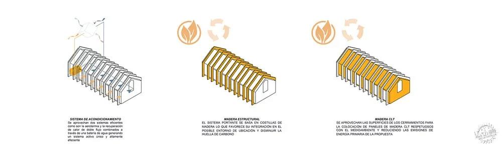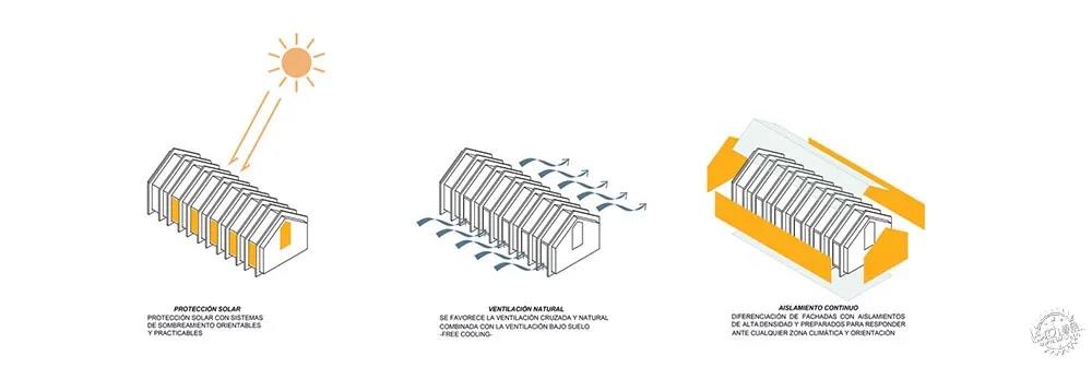 全球化設計以減少需求為基礎,注重節能標準,建筑師應用了許多被動式策略,其中包括緊湊連續的隔熱系統、適應性太陽能保護體系、動態負荷控制或自然通風體系。在高峰需求時,項目的目標是在5/7天的10/24小時中實行連貫的積極策略,將消耗降至最低。除此之外,建筑師還在整個項目中結合應用空氣熱能和雙流熱焓回熱器,這可以通風與控制溫度,另外再利用空氣熱能和地暖來減少耗能。