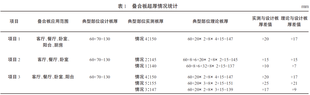 上述3個項目調研結果中,疊合板應用范圍、典型部位設計板厚、典型部位實測板厚、典型部位理論板厚、實測與設計板厚差值、理論與設計板厚差值如表1所示。由表1可知,疊合板實測板厚>理論板厚>設計板厚。