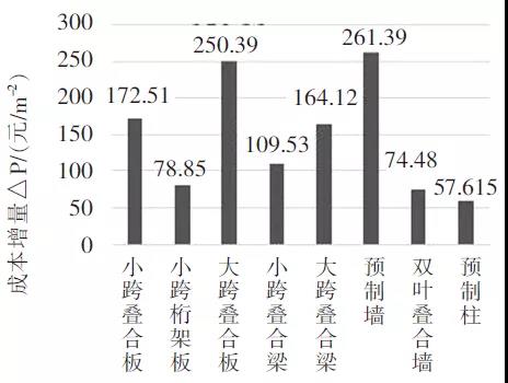 由表2及圖3可知,不同建筑部位采用預制構件引發的成本增量差異很大。預制墻的成本增量值最大,為261.39元/㎡,其次是大跨度疊合板,為250.39元/㎡。成本增量最小的情況為雙葉疊合墻,為74.48元/㎡。從構件類別角度分析,除了小跨桁架板的情況以外,其他種類疊合板的成本增量均增大很多。而當墻構件采用裝配式形式時,預制墻與雙葉疊合墻兩種預制形式在成本增量上有很大不同,其中前者的成本增量為后者的近4倍。而在柱、梁構件采用裝配式形式時,成本增量增長幅度較為平穩。