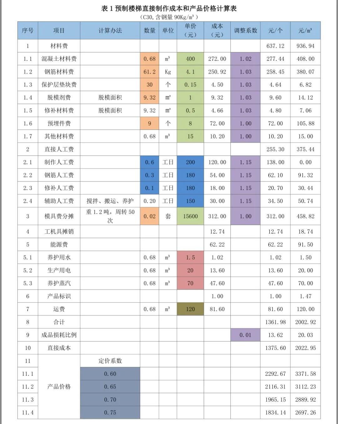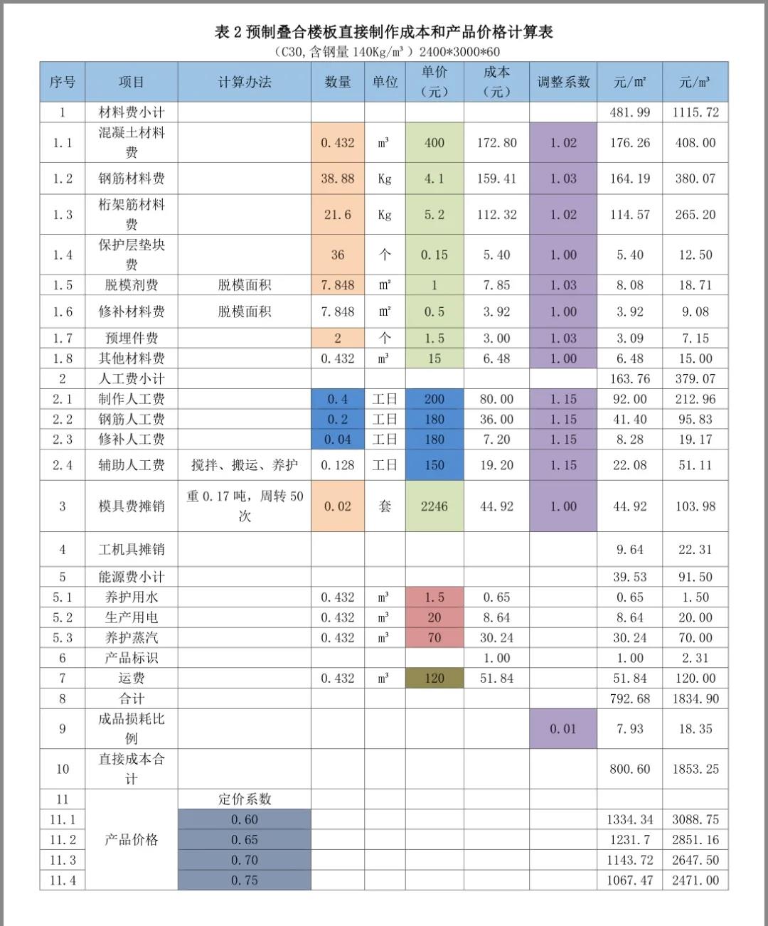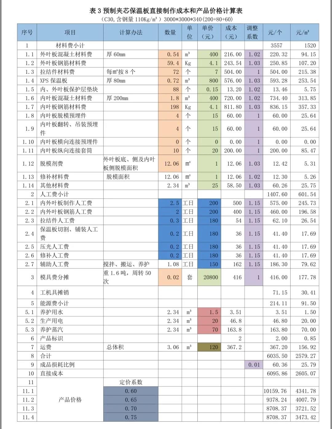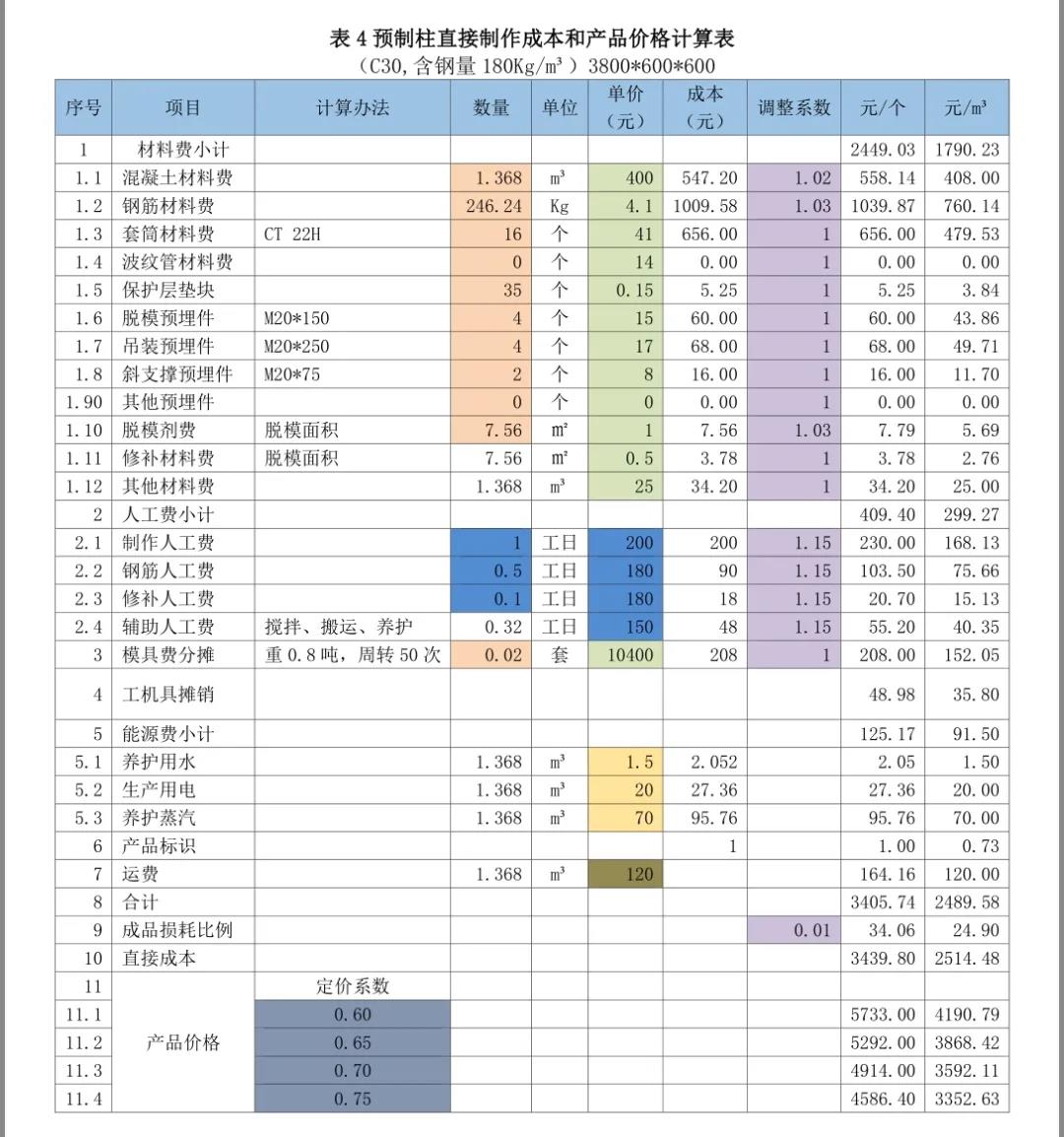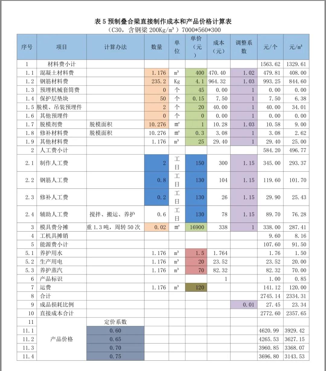 以下分享摘自紅寶書之《裝配式混凝土建筑——如何把成本降下來》,是從構件廠家的角度進行的價格組成介紹,亦可用于對預制構件價格合理性判斷的方法。2)然后計算費用(包括間接制作成本、營銷費用、財務費用和管理費用)、稅費和利潤這三個方面在價格中的比例。3)用100%減去上述的比例,就得到了定價系數——直接制作成本在價格中的比例。4)用直接制作成本除以定價系數就得到了預制構件價格。即:預制構件價格=直接制作成本/定價系數。通過成本要素統計法,計算得到某一類預制構件的直接制作成本是1800元/m3。通過對以往數據的統計和計劃預算的分析,確定費用(包括間接成本、營銷費用、財務費用和管理費用)占預制構件價格的比例為20%。通過對增值稅抵扣情況的統計分析和土地使用稅和房產稅的分攤,稅費占預制構件價格的比例為10%。匯總上述比例,該構件的費用、稅金、利潤占預制構件價格比例的合計為40%。100% - 40%=60%;定價系數為0.60。需要注意的是,在計算和確定預制構件的定價系數時,要根據費用分攤占預制構件價格的比例、預期的利潤率和稅費在預制構件價格中的比例,根據市場行情的分析,根據企業狀況和定價策略等因素確定。預制構件銷售價格=直接制作成本/定價系數=1800/0.60=3000元/m3。也可以用Excel表方便的進行預制構件直接制作成本和產品價格計算。以下測算表格為舉例說明,各項數據僅供參考。表3預制夾芯剪力墻保溫板直接制作成本和產品價格計算表;1)成本欄為數量欄與單價欄的乘積;調整后成本欄為成本欄與調整系數欄的乘積;小計為各分項成本的合計;每個預制樓梯、每平方米疊合樓板、每個預制柱、每個預制梁、每塊預制夾芯保溫板造價為直接成本除定價系數;每立方米造價為每個預制樓梯造價、每平方米疊合樓板、每個預制柱、每個預制梁、每塊預制夾芯保溫板造價除混凝土材料數量。2)在表里只要填寫或修改相關項目數量、單價、調整系數及定價系數(表中標記有顏色的部分),就會得到預制構件的直接制作成本和不同定價系數下的產品價格。①材料數量、模具費計算使用的數量由技術部門提供(橘色)。②材料單價、模具單價(以下各表均按13元/Kg)由采購部門提供(混凝土如果是企業自產的話,價格可以另行計算而得)(綠色)。③人工費數量和單價由人力資源部門協同定額管理部門提供(藍色)。④工機具攤銷(以下各表取材料費的2%)由財務部門提供。⑤每立方米預制構件需要的水、電、蒸汽費由能源管理部門提供(黃色)。⑥每立方米預制構件運費由運輸管理部門提供(土黃色)。4)材料和成品考慮到損耗,增加了調整系數(紫色)。5)人工費調整系數是指工資中還應包括勞動保險、公積金、工會經費、其他福利費、勞保費用,勞務公司工人包括勞務公司的管理費等,適當分攤淡季待工時的人工費用。本章內容節選自紅寶書之《裝配式混凝土建筑——如何把成本降下來》,購買請點擊下面小程序:(注:蘋果手機用戶,請點擊文末“閱讀原文”)
