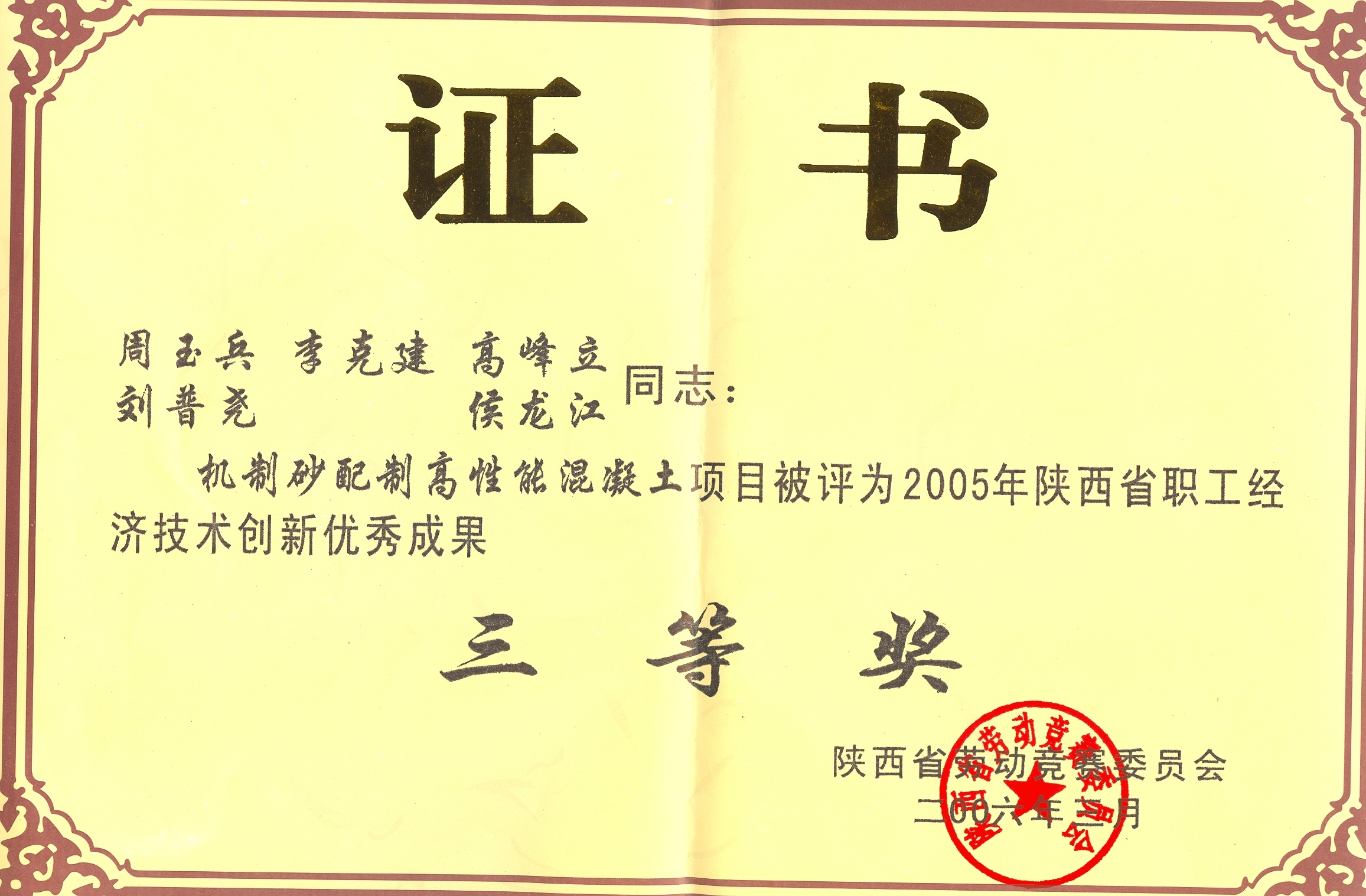 《機制砂配制高性能混凝土》獲陜西省職工經濟技術創新優秀成果三等獎